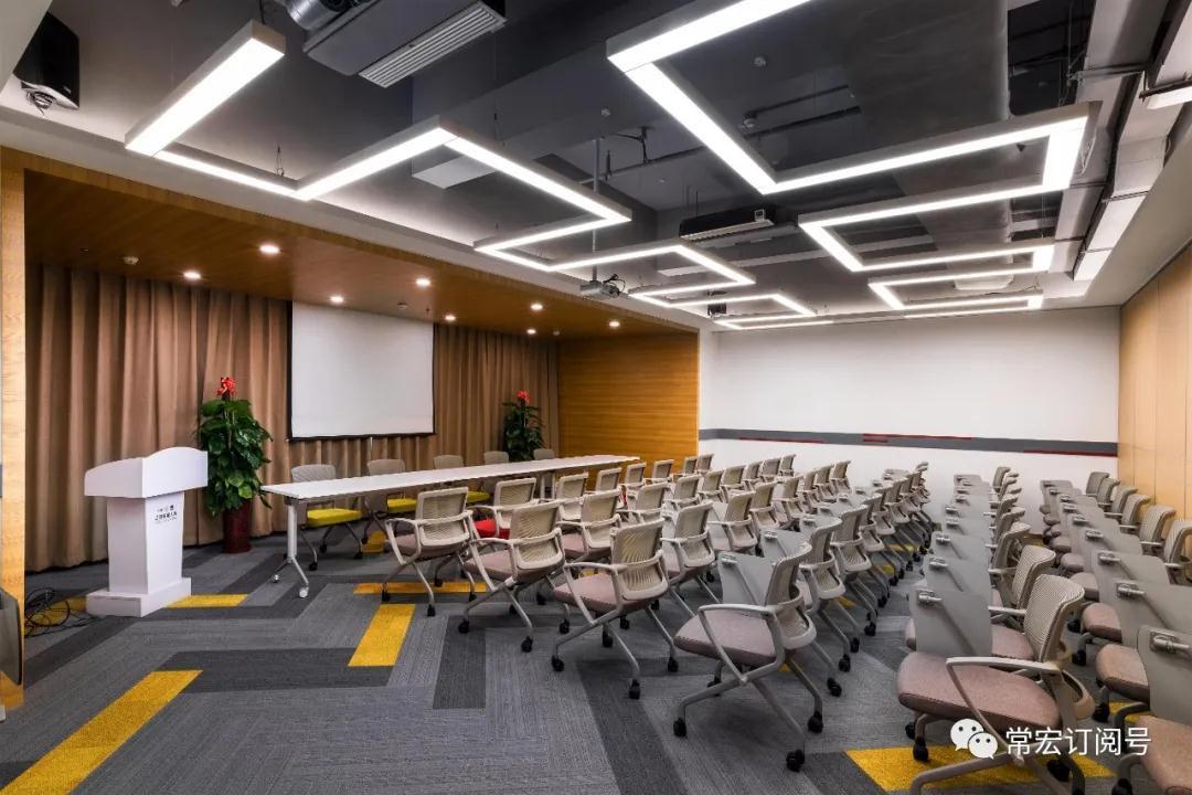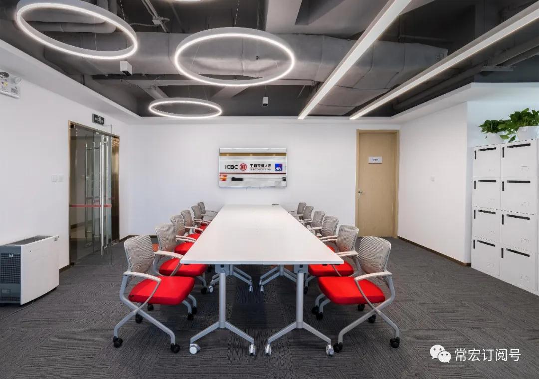 這種風(fēng)格貫穿始終,同時(shí)也在燈具上被體現(xiàn)出來,主要空間采用了細(xì)長的磁吸燈具,顯得頂面干凈簡潔,細(xì)長深色的磁吸燈和吊掛軌道燈又能夠襯托出工業(yè)風(fēng)格。此外,設(shè)計(jì)師根據(jù)不同空間屬性變化,在空間中點(diǎn)綴工銀安盛的VI跳色,使整體增添了親切、溫暖、靈動(dòng)的感覺。