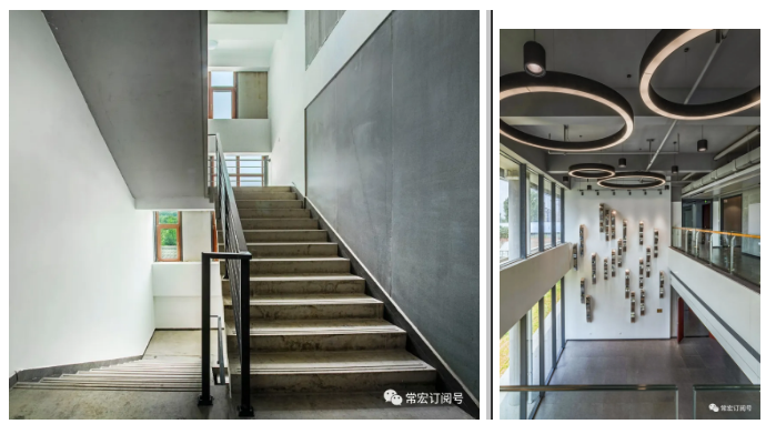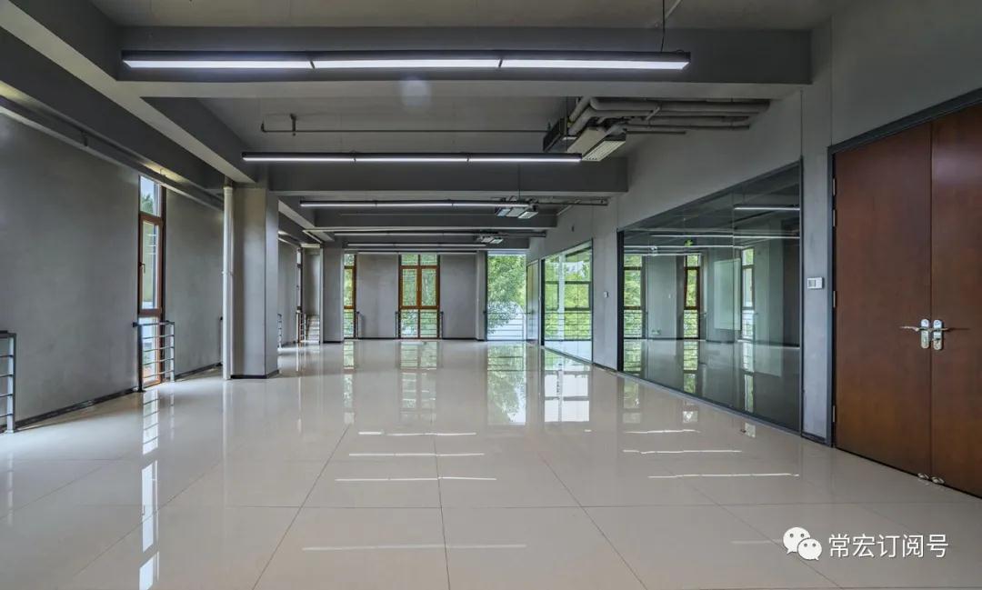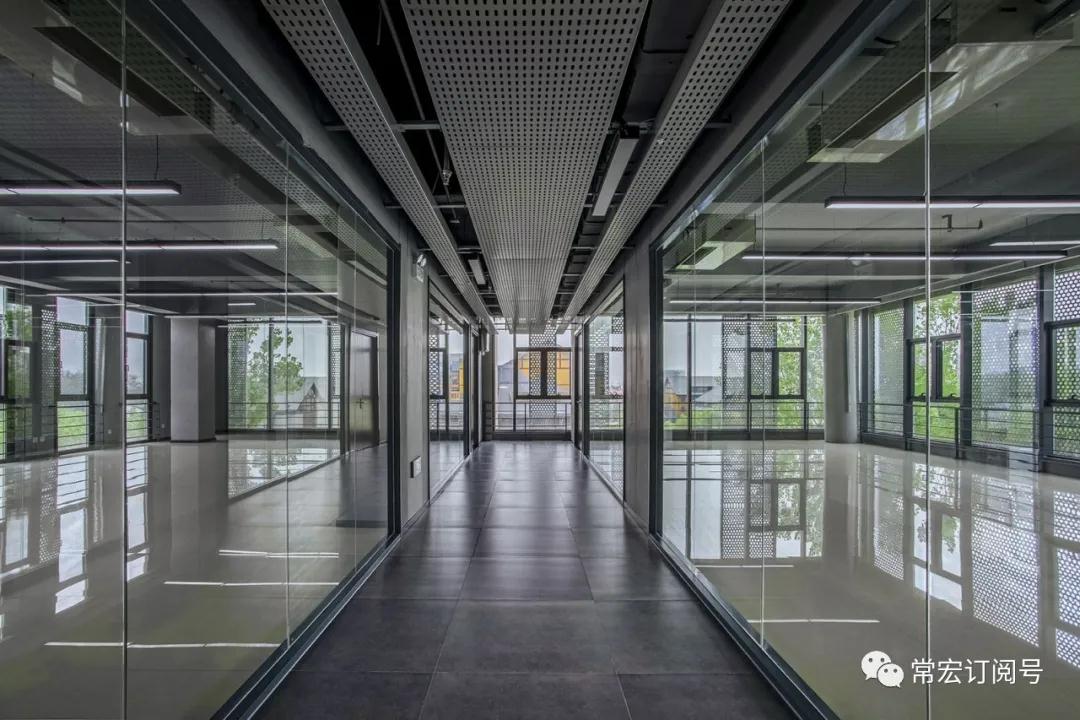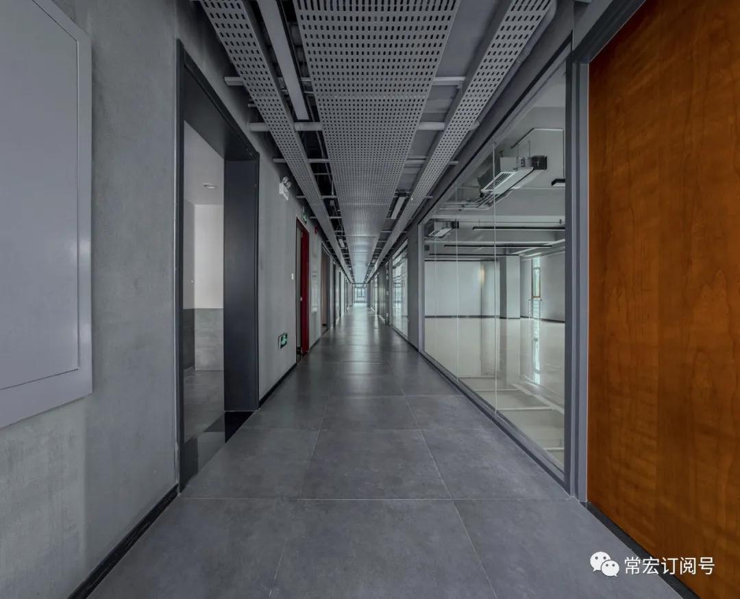本項(xiàng)目室內(nèi)設(shè)計(jì)風(fēng)格延續(xù)了外觀設(shè)計(jì)的工業(yè)建筑特點(diǎn),把清水面的樸素質(zhì)感延伸到室內(nèi)。如室內(nèi)走廊吊頂各種管線的外露,加以穿孔鋁板半遮半掩的裝飾,既強(qiáng)調(diào)了工業(yè)特點(diǎn),又是對(duì)建筑外觀裝飾語(yǔ)言的延續(xù)和呼應(yīng)。整個(gè)室內(nèi)的空間設(shè)計(jì)與建筑融為一體。