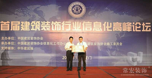 5月22日,首屆建筑裝飾行業(yè)信息化高峰論壇在美麗的廈門隆重舉行。常宏裝飾作為此次中國建筑裝飾協(xié)會增補為"中國建筑裝飾行業(yè)新型工業(yè)化科學研究院"的兩家企業(yè)之一,在大會上被授牌成立“新型工業(yè)化科學研究院”。至此,中國建筑裝飾行業(yè)科學研究院全國總數(shù)已達26家。