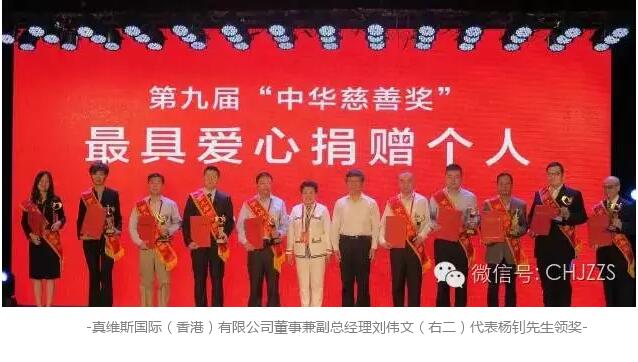 9月1日,第九屆“中華慈善獎(jiǎng)“頒獎(jiǎng)典禮于江蘇省南通市新區(qū)會(huì)議中心隆重舉行,香港中華總商會(huì)會(huì)長(zhǎng)、真維斯所屬旭日集團(tuán)董事長(zhǎng)楊釗憑借多年來(lái)對(duì)公益慈善事業(yè)的不懈投入獲此殊榮。中華人民共和國(guó)國(guó)務(wù)委員王勇接見(jiàn)了第九屆中華慈善獎(jiǎng)獲獎(jiǎng)代表并合影留念。