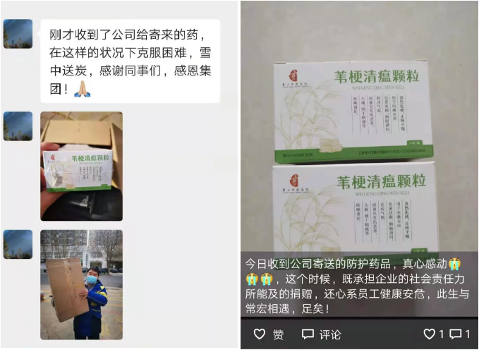 2021年,新冠疫情再度爆發(fā),香港旭日集團及常宏本部心系員工健康,選了經(jīng)過2020年初抗疫前線應(yīng)用的有效藥品「葦梗清瘟顆粒」(「備案文號」贛藥制備:Z20200002000)發(fā)放給全體員工。1月初,常宏將首批顆粒發(fā)放給一線工人,后受疫情影響,在石家莊市快遞恢復(fù)的第一時間,14日起陸續(xù)將藥品以郵寄的形式發(fā)放給全體員工,用于大家預(yù)防新冠肺炎,以實際行動關(guān)心關(guān)愛員工,讓大家安全感滿滿。
